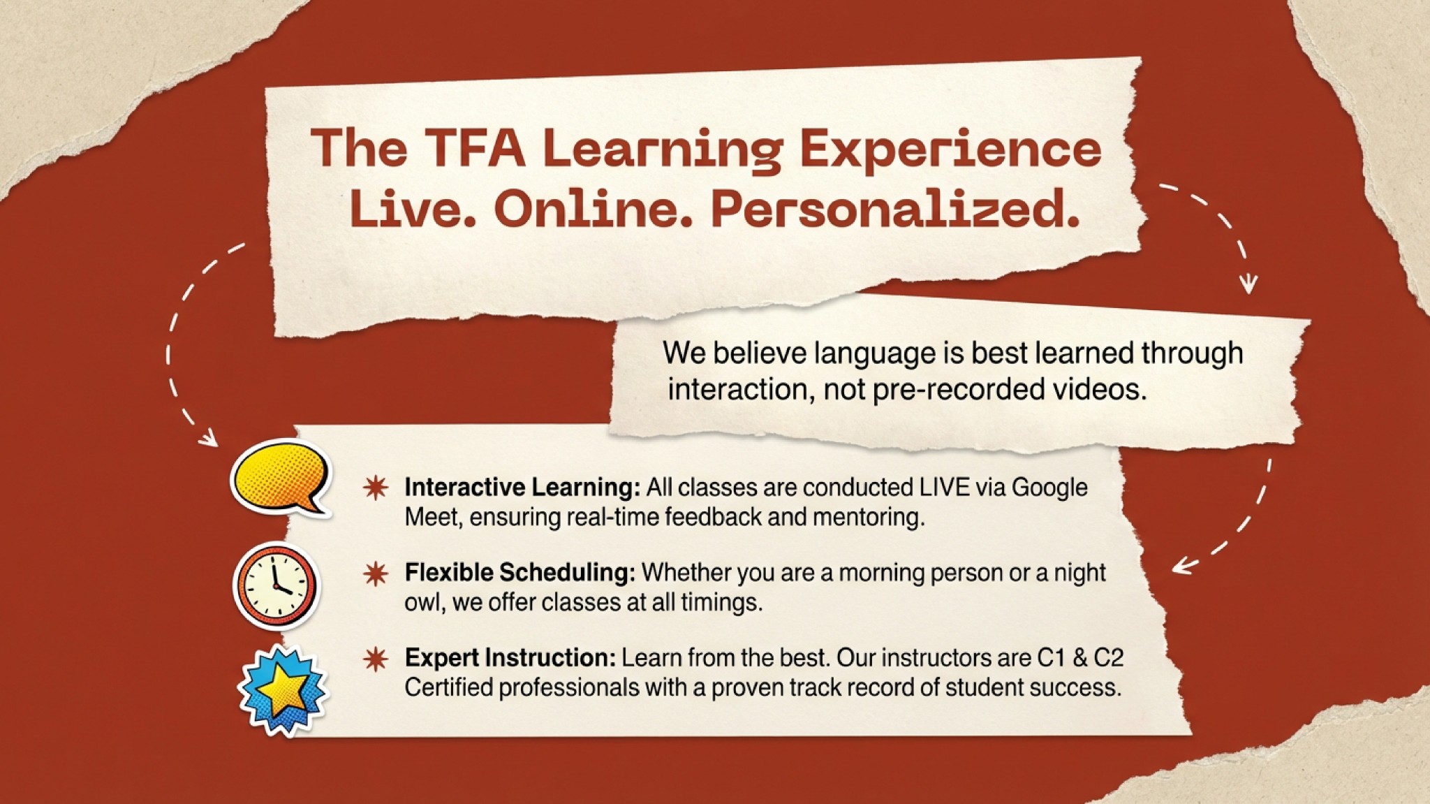 Disclaimer: Toronto French Academy (TFA) is a private language school and not a Designated Learning Institution (DLI). Our courses are non-accredited and do not provide immigration or academic certification. Students are responsible for maintaining their own immigration status. This website’s content is for educational purposes only and is not legal or immigration advice.